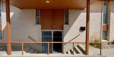 OUR ENTRANCE IS ON THE SOUTH SIDE OF THE BUILDING, RIGHT IN THE CENTER OF THE BUILDING DOWN EITHER SET OF STAIRS.